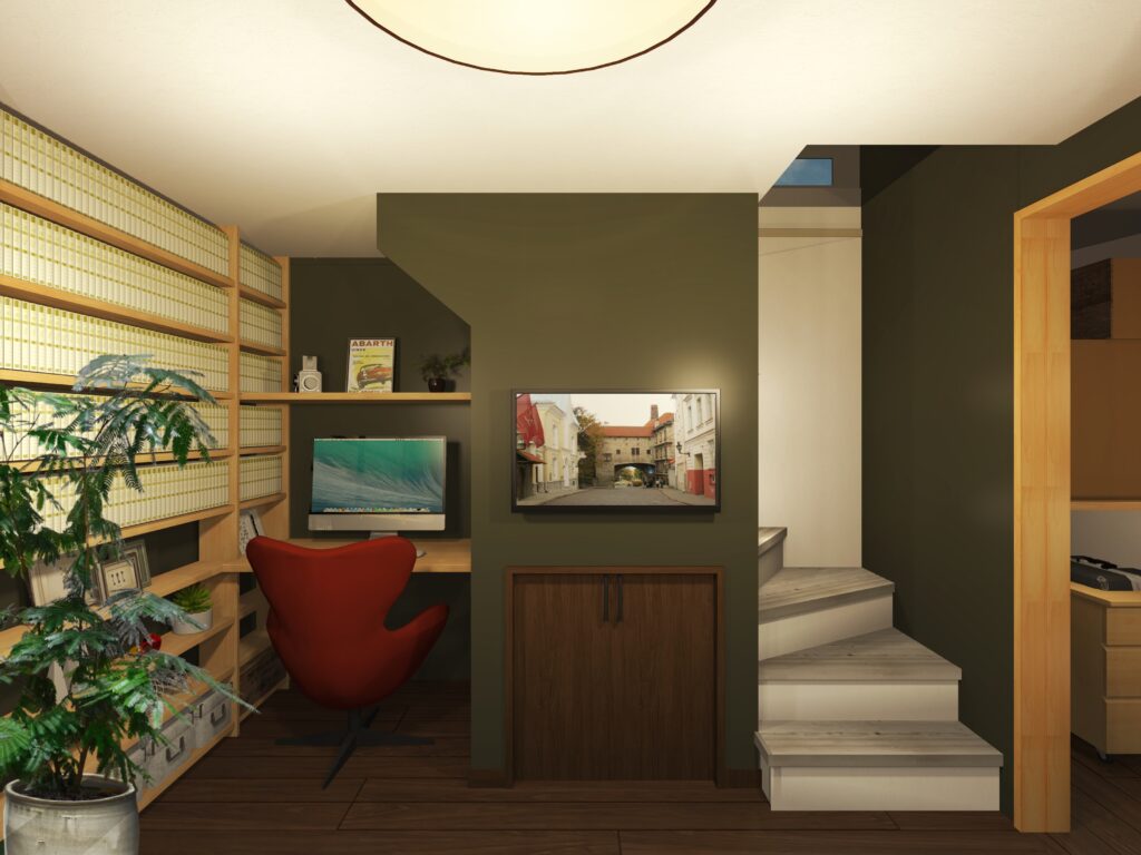 地下室を仕事部屋にすると、仕事(地下)とプライベート(地上)の切り替えがしやすく、気持ちのスイッチを自然に入れ替えられるのも魅力です。