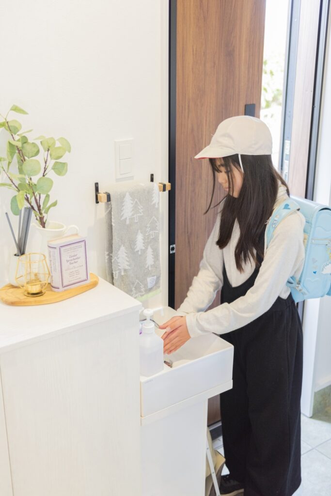 プライベートな空間に案内せず、気軽に手を洗ってもらえますよ。来客側も「洗わないと失礼かな」と迷わずに済みますし、室内を清潔に保つことができます。